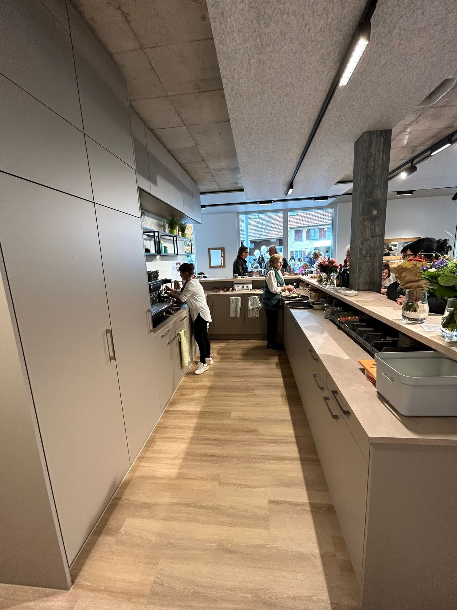 Danach wurden Akustikpaneele montiert, sowie eine Küchentheke mit integriertem Kühlschrank, Waschbecken und Abfalltrennung und eine separate Ladentheke mit Kassenbereich nach den Vorstellungen und Wünschen der Kundin geplant und montiert.
